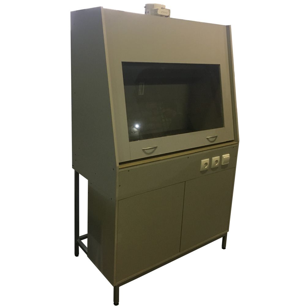 Шкаф ШВМ-04 оборудован светильником дневного света, вентилятором с патрубком d160 мм, угольным фильтром для очистки воздуха от паров, возникающих в процессе проведения работ и гибким шлангом для соединения вентилятора с фильтром. Угольный фильтр располагается вне шкафа ШВМ-04 в удобном для работы месте и позволяет производить выброс воздуха в рабочее помещение или централизованную вентиляцию. Вытяжная камера шкафа ШВМ-04 оборудована подъемным экраном из стекла. В нижней части шкафа располагается тумба с тремя полками для хранения лабораторной посуды и оборудования.