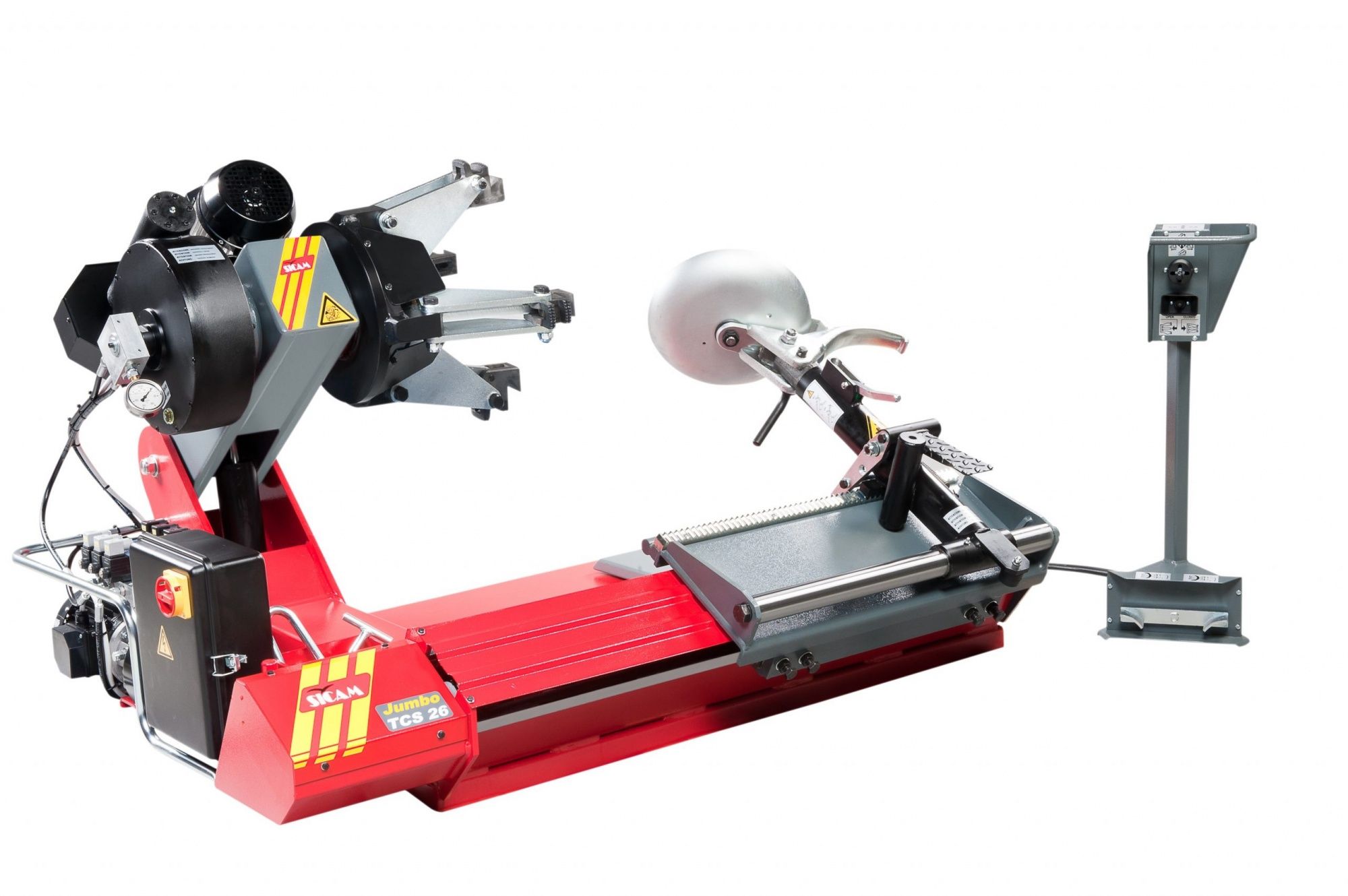 Универсальный шиномонтажный стенд. Предназначен для монтажа/демонтажа колес с глубоким неразборным и плоским разборным ободьями (с кольцом), а так же для бездисковых колес грузовых автомобилей, сельскохозяйственной, карьерной и другой специальной техники с диаметром диска от 14" до 42" (с опциональным комплектом удлинителей до 56"), шириной до 1250 мм. Напряжение питания 380 В. Цвет красный (RAL 3000).