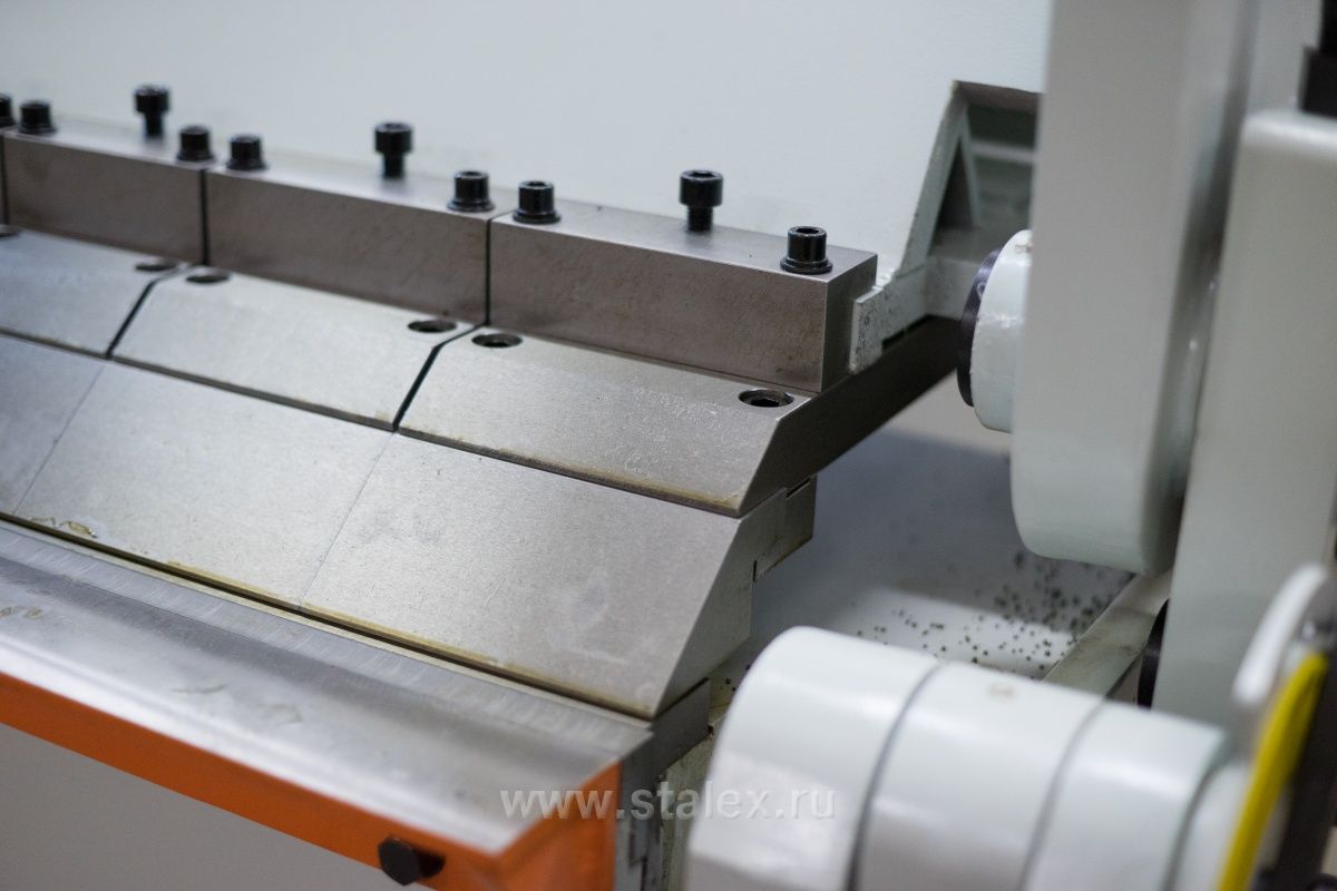 Верхняя прижимная балка является сегментной, сегменты произведены из специальной закаленной стали - данная особенность станка позволяет работать с широкими и сложными профилями, таких как: короба, поддоны и аналогичные конструкции. Верхняя сегментная балка на станке Stalex HW1830х3.5 состоит из 17 сегментов: 6 сегментов – 75 мм, 3 сегмента – 100 мм, 6 сегментов – 125 мм, 2 сегмента 150 мм.