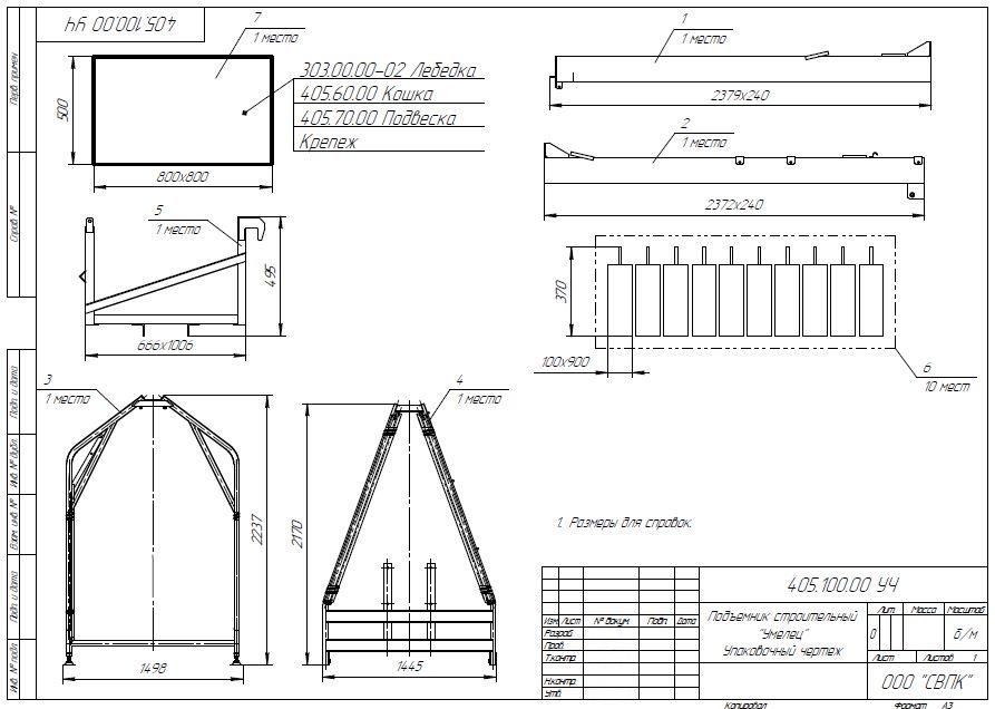 Подъемник Умелец ПС-500 состоит из следующих основных узлов и деталей: кошки 10 с подвеской 11, балок 3 и 4, стойки передней 5, стойки задней 6, стяжек 7, 8 и 13, лебедки электрической 1. Металлоконструкции подъемника крепятся между собой стандартными крепежными изделиями, сборочными единицами и деталями, входящими в комплектацию подъемника. Устойчивость подъемника во время эксплуатации обеспечивается противовесами в количестве 10 штук.