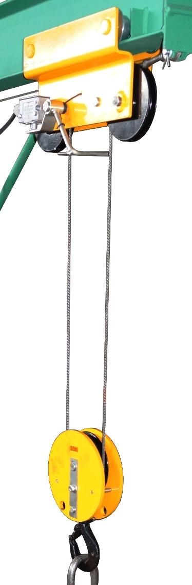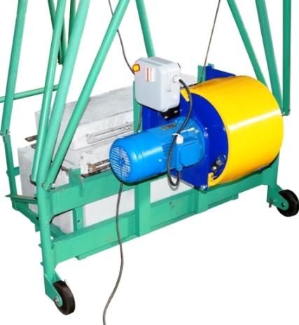 Лебедка крепится на задней стойке болтовым соединением М12. Лебедка состоит из корпуса, образованного двумя щеками (соединенными между собой стяжками), электродвигателя, барабана и зубчатых колес. Под барабаном расположен прижимнй ролик для обеспечения более качественной навивки каната. Вращающийся барабан огражден защитным кожухом. На щеке закреплен электрический пульт управления. От пульта отходит кабель с кнопочным тельферным постом и микровыключателем, который в процессе эксплуатации крепится к передвижной кошке 10.