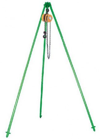Тренога состоит из трех стоек (1), одна из которых имеет регулировку по длине при помощи винта, соединенных между собой кронштейном (2). На втулке кронштейна закреплен рым-болт (3), служащий для подвески грузоподъемного устройства. В нижней части стоек находится замковое устройство служащее для фиксации треноги в сложенном состоянии. Тренога поставляется в собранном виде. В комплект поставки не входит ручная таль.