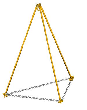 Тренога состоит из трех стоек, соединенных кронштейном, для крепления грузоподъемного механизма (как правило используется ручная таль, не входит в комплект поставки) в основание кронштейна ввинчивается рым-болт или используется омегообразная скоба.