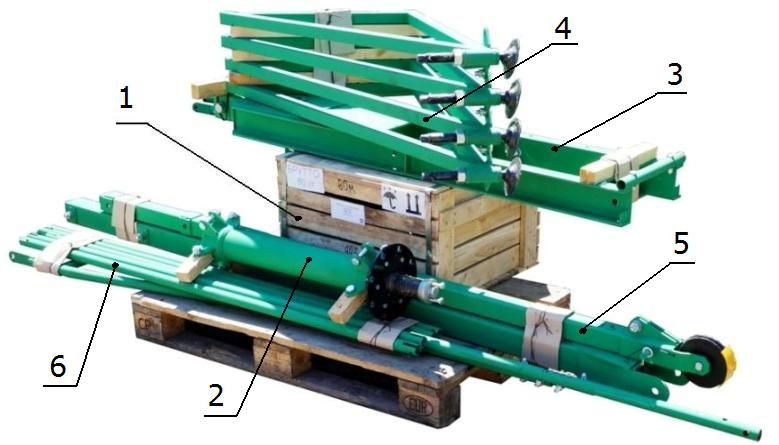 Кран поставляется в разобраном виде. На фото показаны отгрузочные места: 1 - Электрическая лебедка для подъема опускания груза (в ящике); 2 - Колонна; 3 - Поворотная рама; 4 - Ноги (детали опорной платформы); 5 - стрела; 6 - стяжки. В комплекте поставки также имеются железобетонные контргрузы в количестве 6 штук.
