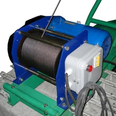 К раме крепится лебедка 1. В корпусе лебедки закреплены электродвигатель и барабан. Электродвигатель передает вращающий момент на барабан через двухступенчатый редуктор, закрытый защитным кожухом. На щеке лебедки закреплен электрический пульт. От электропульта отходит один кабель с кнопочным тельферным постом 53 и микровыключателем 14, закрепленным на раме.