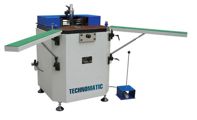 Одноголовочный гидравлический пресс для обжима углов алюминиевых окон и дверей, давлением 48 КН, с регулируемой высотой ножей и отступом от вершины угла. Выносные штанги для поддержки заготовок.
